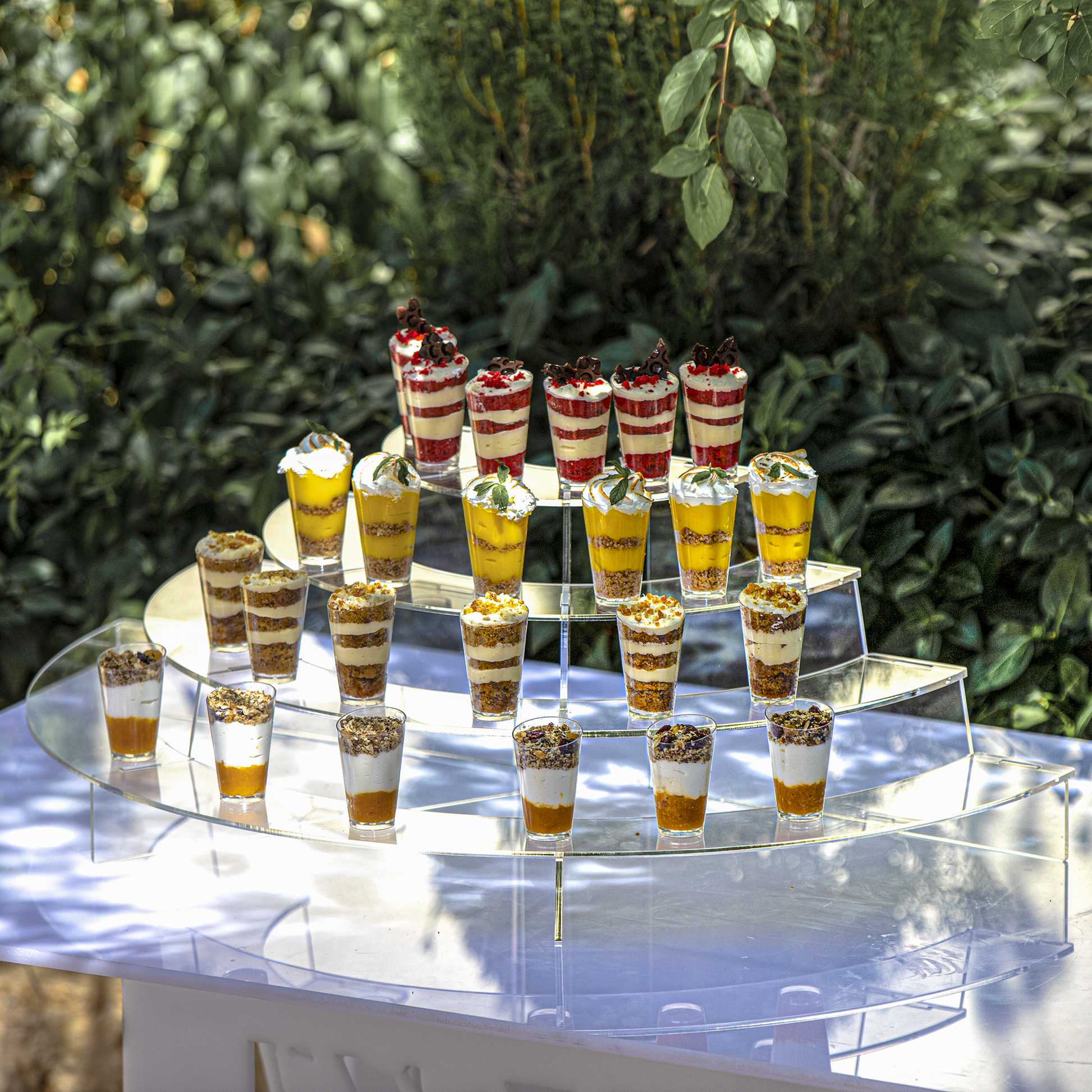 Elevate your display with our Half-Circle 4-Level Riser. Crafted from high-quality materials, this riser features a sleek, modern design with four tiered levels arranged in a half-circle shape. Perfect for showcasing a variety of items, from collectibles and merchandise to desserts and party favors, each level offers ample space to create an eye-catching presentation. The tiered design allows for a clear view of all items, ensuring nothing goes unnoticed. Ideal for retail displays, trade shows, or special events, this riser adds sophistication and functionality to any setting. Lightweight yet sturdy, it's easy to set up, move, and store, making it a versatile addition to your display toolkit.