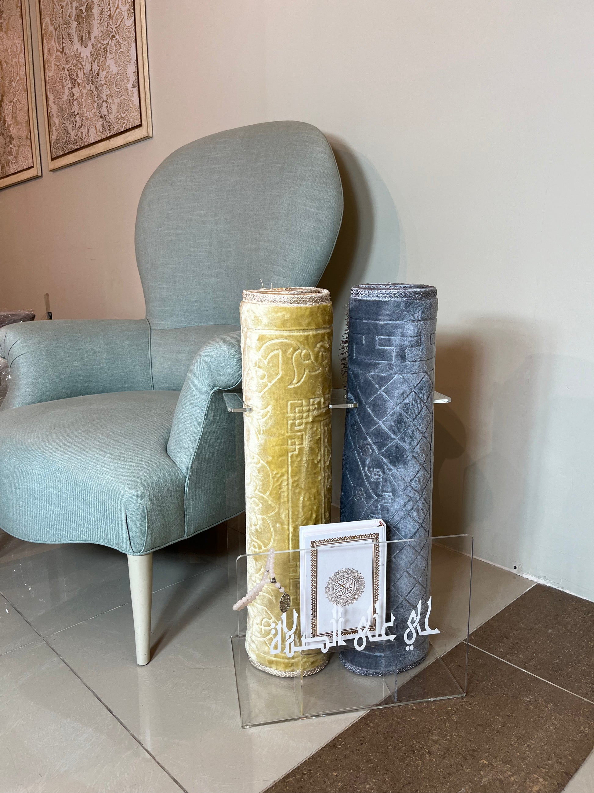 Keep your prayer carpet neatly stored with this elegant acrylic holder. Designed for easy access and protection, it’s perfect for organizing and preserving your prayer rug. Its sleek and compact design fits seamlessly into any space, making it a practical and stylish addition to your spiritual routine.